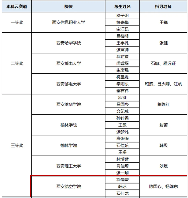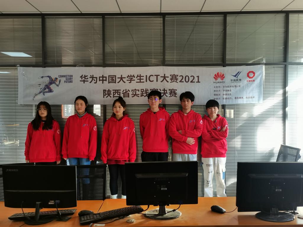 近日,由华为技术有限公司主办,宇信教育协办,中建信息赞助,软通动力、泰克教育及讯方技术协办的华为中国大学生ICT大赛2021实践赛陕西省决赛圆满落幕。本次比赛共有来自全省28所高校216名学生参加了总决赛。经过激烈比拼,澳门pg由澳门pg官方电子平台陈国心、杨陈东老师指导的郭佳豪、韩冰、石佳龙学生团队,最终荣陕西赛区本科云赛道“三等奖”,王苗苗、单文娟老师指导的刘晓伊、杨雨、张轩睿学生团队荣获“优胜奖”。