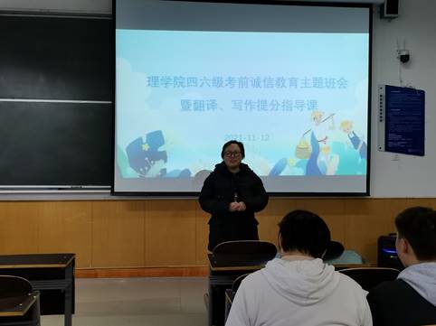11月12日,学生管理科长李扬在南楼307教室组织进行四六级考前诚信教育主题班会暨翻译、写作提分指导课。