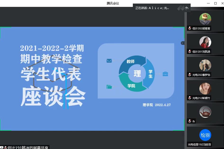 为了加强学院学风建设,打造良好的学习生活环境,更好地服务学生,2022年4月27日,澳门pg官方电子平台召开2021—2022学年第二学期期中教学检查学生代表座谈会。澳门pg官方电子平台副院长丁琦、综合办主任杨陈东、学生管理科科长李扬、信息与计算科学专业负责人张惠玲、光电信息科学与工程专业负责人王妙、团总支书记张岩及各班学生代表参加此次会议。会议由李扬主持。