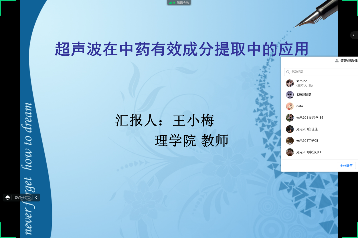 2022年9月17日,澳门pg官方电子平台在腾讯会议线上举办了“超声波在中药有效成分提取中的应用”学术讲座,此次讲座由物理教研室主任王小梅主讲。