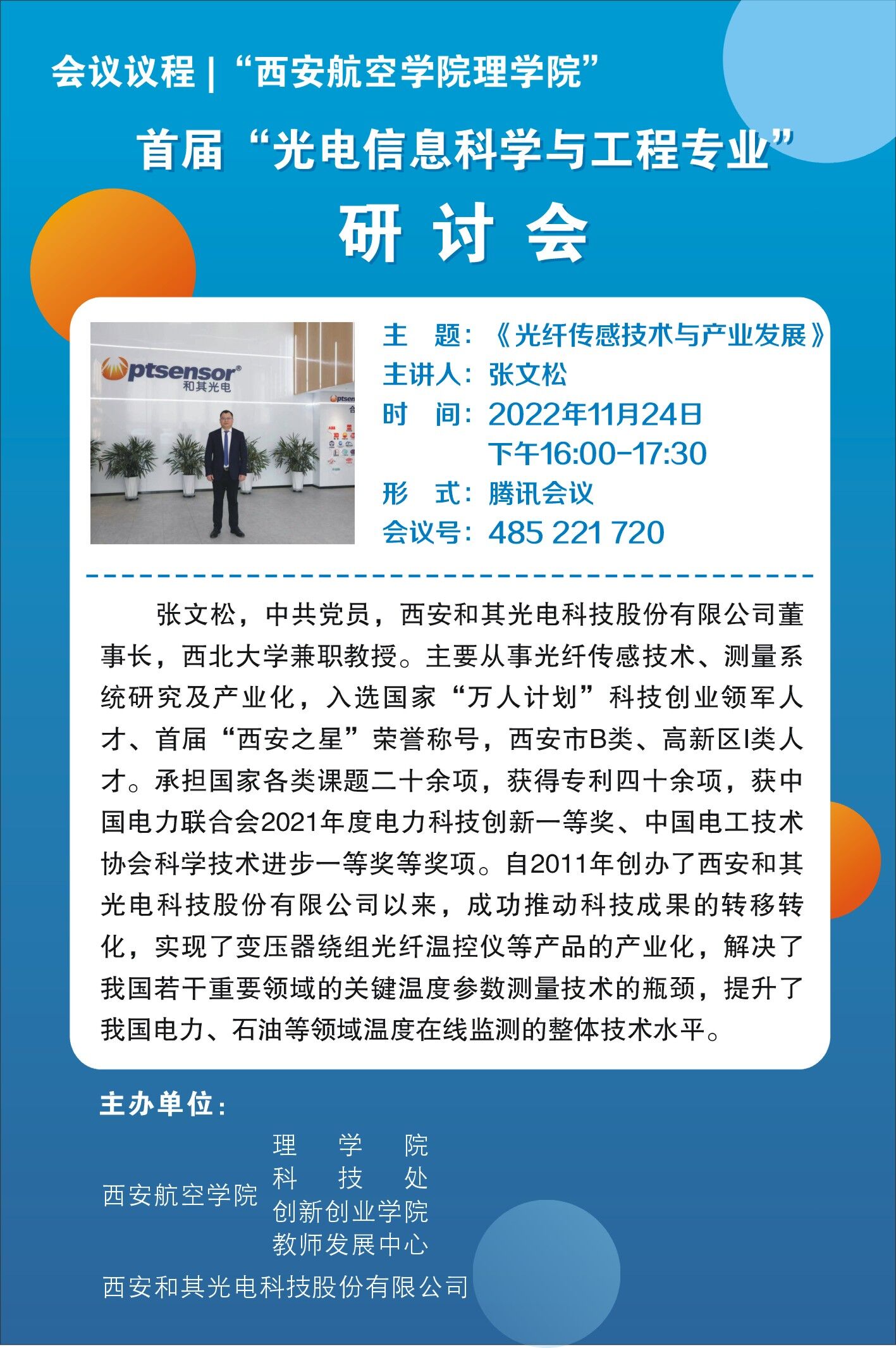 2022年11月24日下午,西安和其光电科技股份有限公司董事长张文松应邀面向全校师生作了题为“光纤传感技术与产业发展”的讲座。澳门pg官方电子平台党总支书记李小光、副院长丁琦及全体物理教师和光电信息科学与工程专业的学生参加了本次讲座,讲座由澳门pg官方电子平台党总支书记李小光主持。