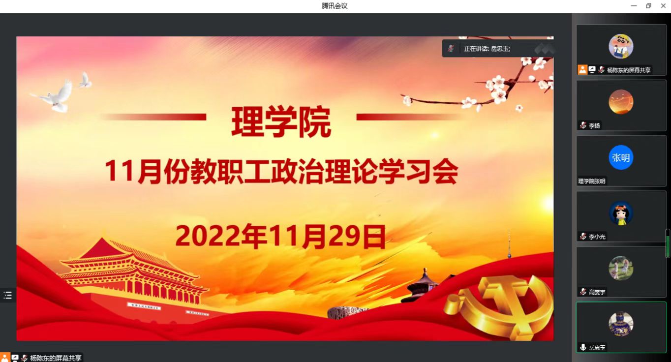 2022年11月29日下午,澳门pg官方电子平台党总支召开2022年11月份教职工政治理论学习研讨会。人文学院党总支书记杨光、统战部综合管理科科长高雯宇旁听会议,澳门pg官方电子平台党总支二级中心组成员、全体无课教师参加线上会议,会议由总支书记李小光主持。