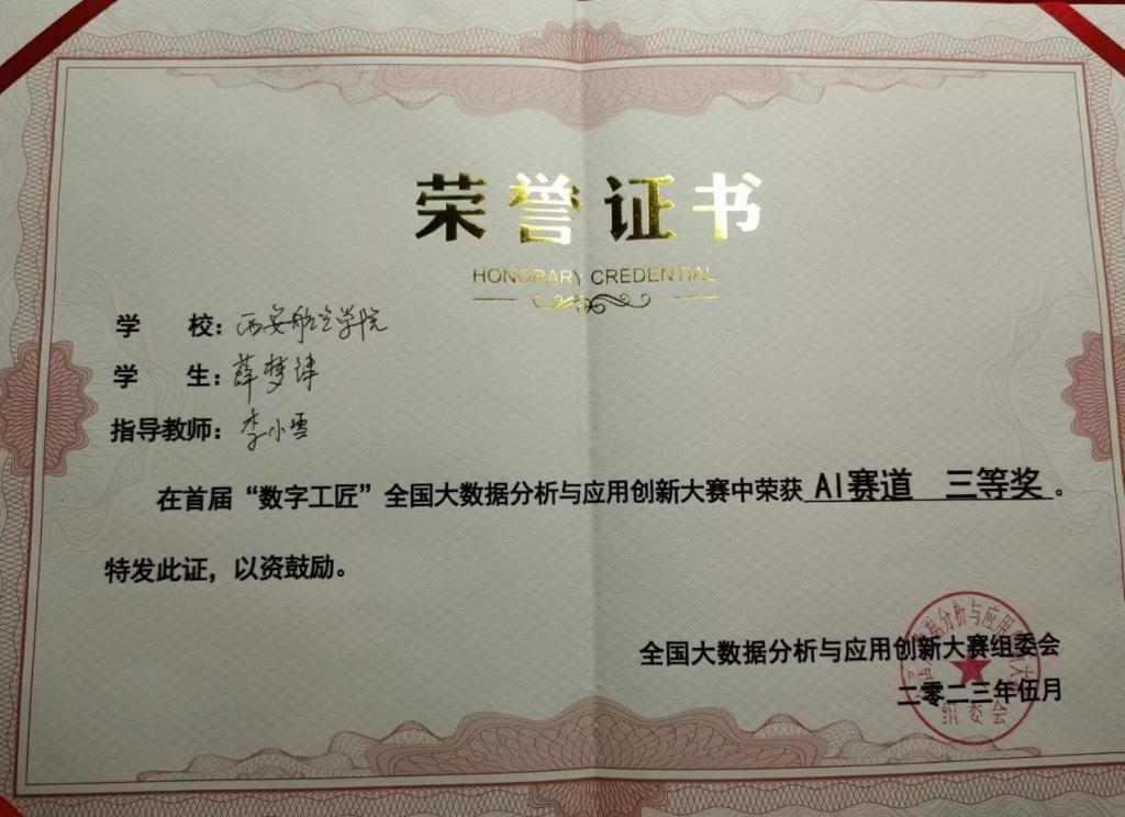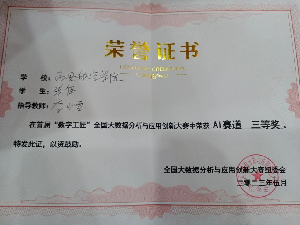 近日,由机械工业经济管理研究院指导,《智慧中国》杂志社、国声智库主办,西安理工大学、美林数据技术股份有限公司承办的首届“数字工匠”全国大数据分析与应用创新大赛总决赛在西安理工大学曲江校区顺利举行,经过激烈角逐,澳门pg李小雪和王苗苗老师指导的信息计算202班薛梦津、张佳2名同学组成的“祺珩”队,荣获AI赛道全国三等奖。