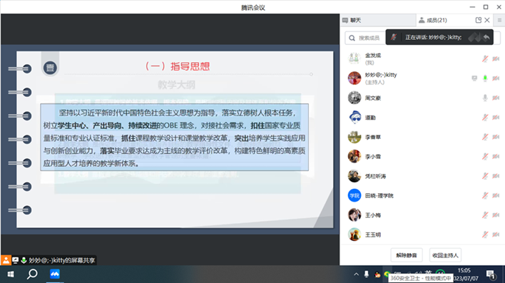 为进一步提高人才培养质量,加强课程思政建设,澳门pg官方电子平台物理教研室于2023年7月7日下午以线上会议方式,召开了2023版光电信息科学与工程专业教学大纲修订与编制研讨会。物理教研室全体成员参加了该会议,会议特邀了学院党总支书记胡红亮和丁琦副院长参加,金发成召集主持。