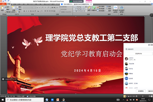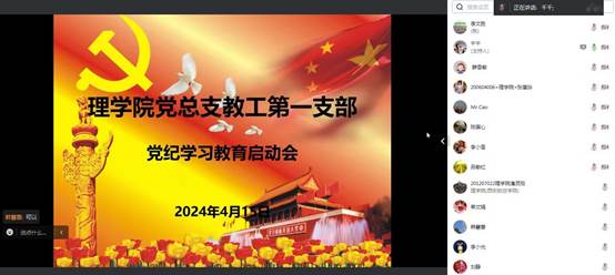 4月15日晚八点,澳门pg官方电子平台党总支通过线上会议方式召开党纪学习教育启动会,会议由党总支书记胡红亮主持并作动员安排,学院党总支成员和各党支部书记参加会议。