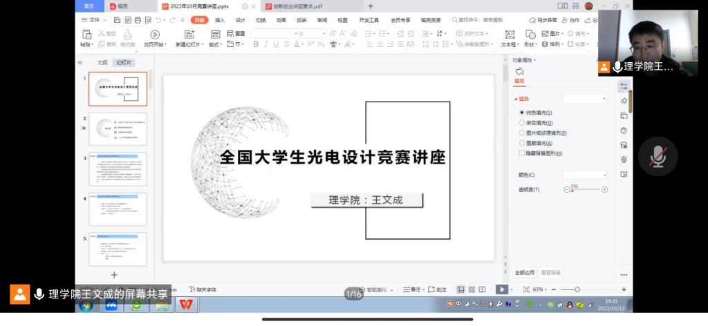 为了提高学院大学生基础学科应用水平,激发大学生创新意识,鼓励广大学生积极参加学科竞赛,10月13日,澳门pg官方电子平台利用线上教学平台为澳门pg学生举办了“数学建模与竞赛”“全国大学生光电设计竞赛”讲座,来自全校各院系的500多名学生参加了讲座。本次讲座由数学建模竞赛项目负责人张蒙和光电设计大赛项目负责人王文成主讲。