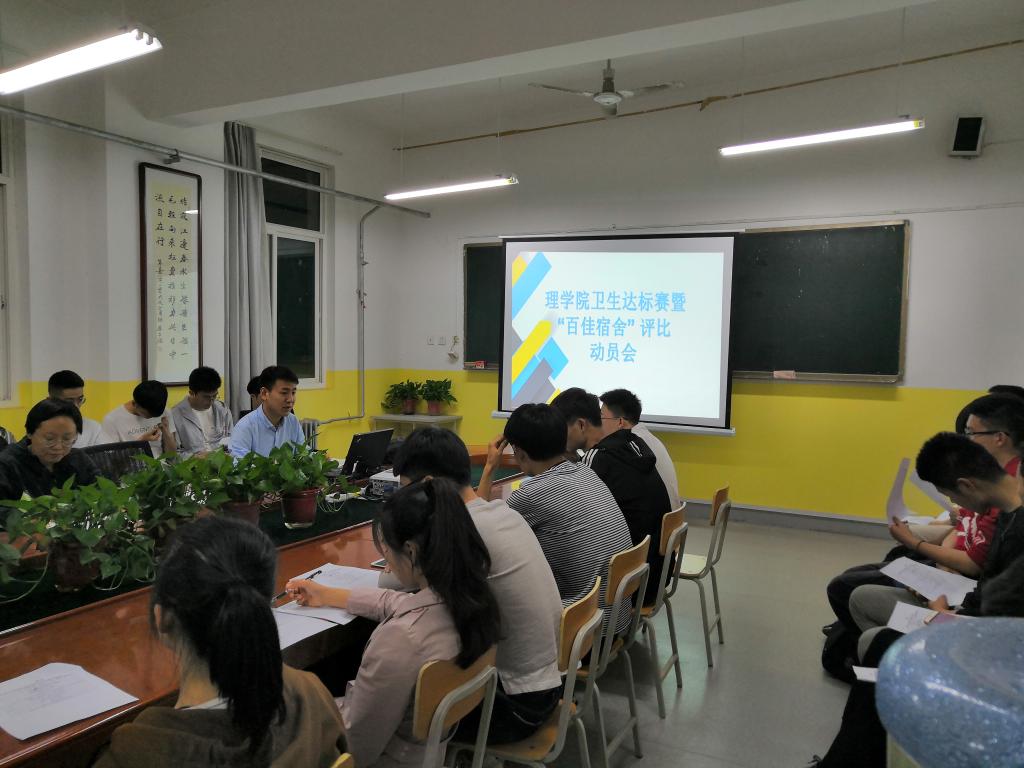 为了使学生保持宿舍环境卫生,养成良好的生活学习习惯,5月9日晚8时,澳门pg官方电子平台在南428召开宿舍环境卫生达标赛暨“百佳文明宿舍”评比动员会。党总支书记李小光、学生管理科科长李扬、团总支书记杨陈东及全体宿舍长参加了此次会议,会议由杨陈东主持。