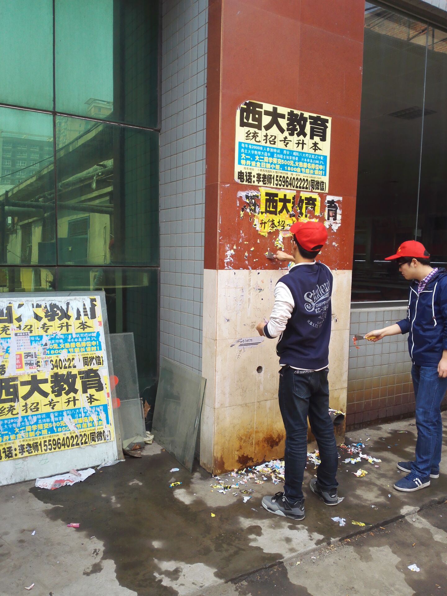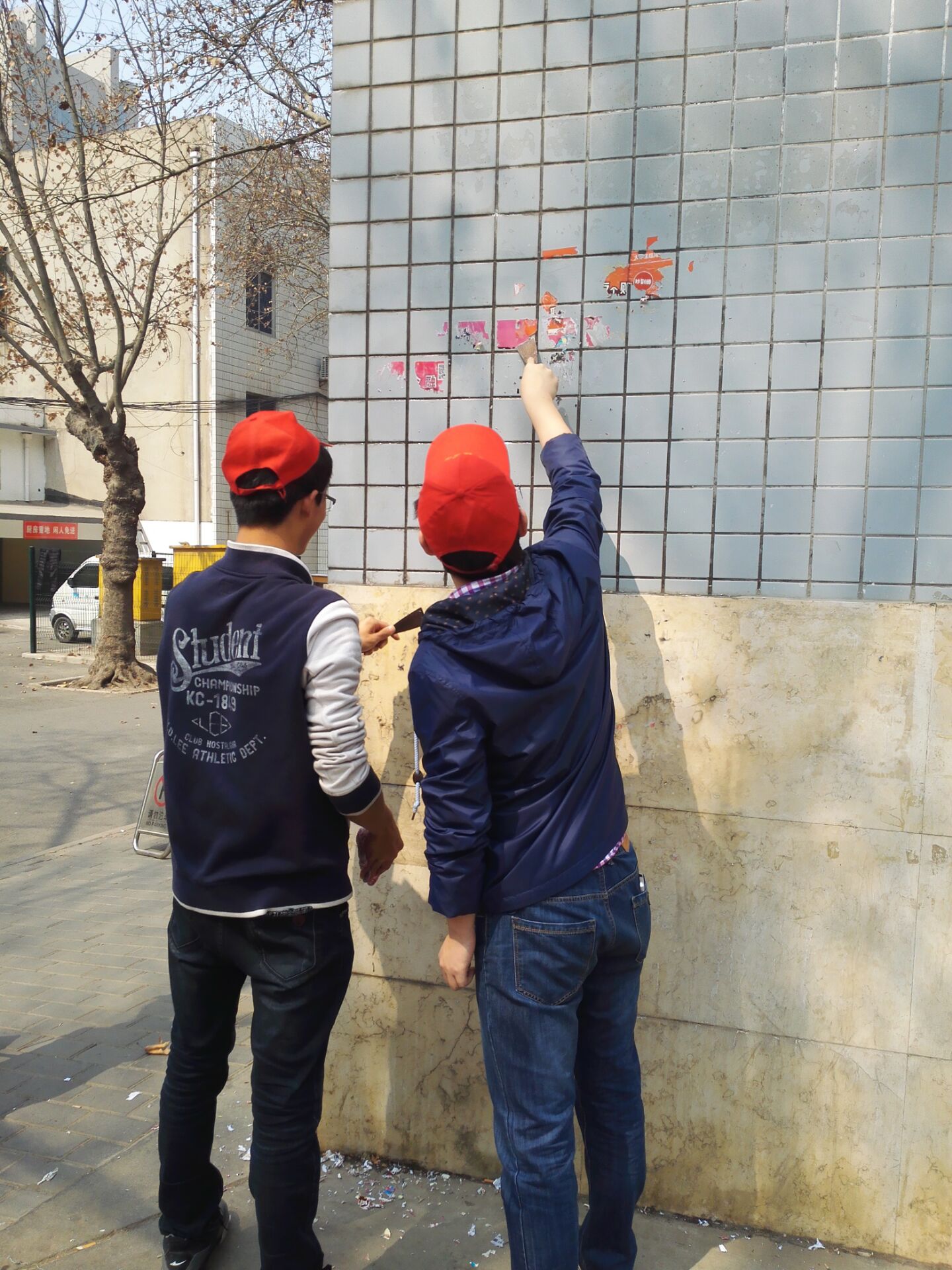 下午1点,参加本次活动的澳门pg官方电子平台志愿者们在学校一号食堂门口集中,由校方清点人数并领取活动工具。之后,在澳门pg官方电子平台青年志愿实践活动部部长李阳的组织下开始小广告清除任务。志愿者们一丝不苟,生怕把墙壁刮花,一点一点地刮除墙壁上的胶体。最后在志愿者们的齐心努力下,2号食堂周围墙上的小广告被尽数铲除。
