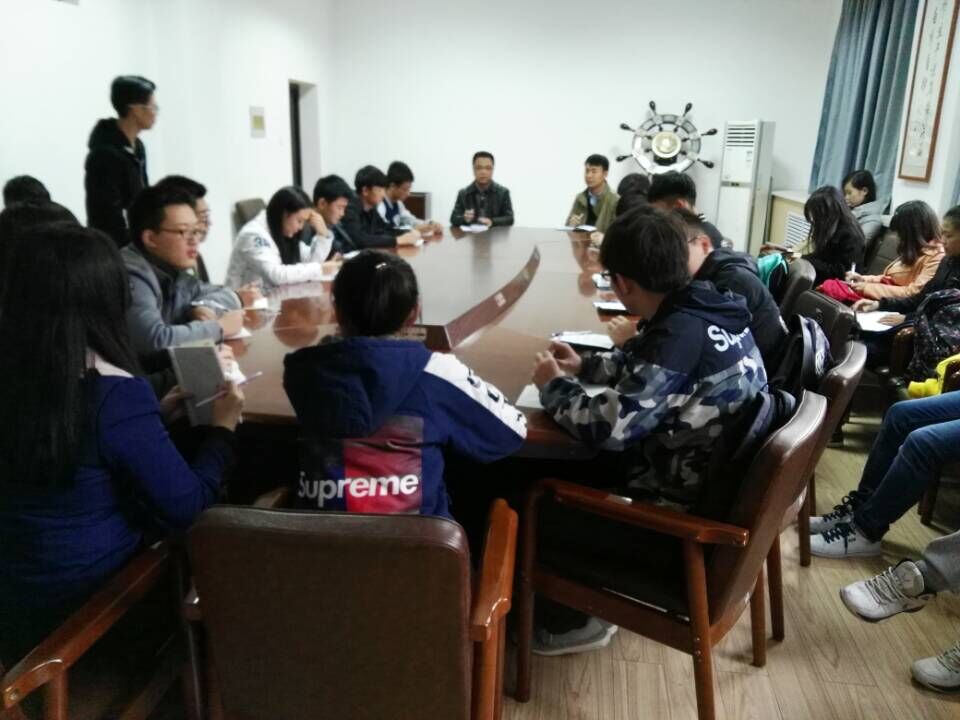 11月5日,澳门pg官方电子平台于北教学楼三楼会议室举办了澳门pg官方电子平台2015-2016学期第三次学生干部例会,参加会议的有澳门pg官方电子平台辅导员曹建波,团总支书记杨陈东,以及澳门pg官方电子平台全体学生会干部。