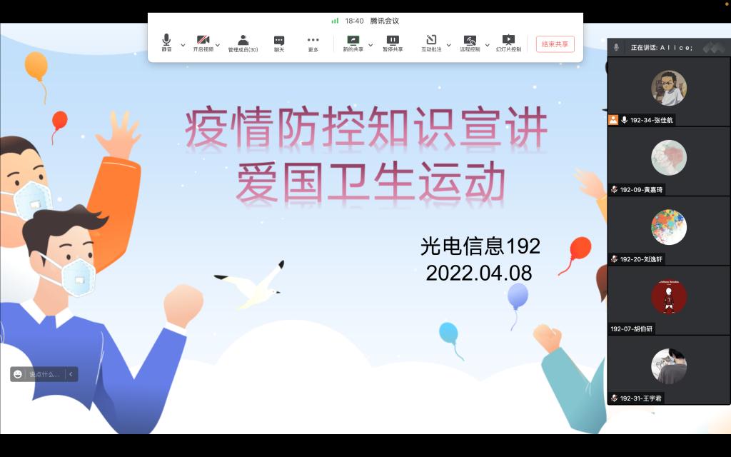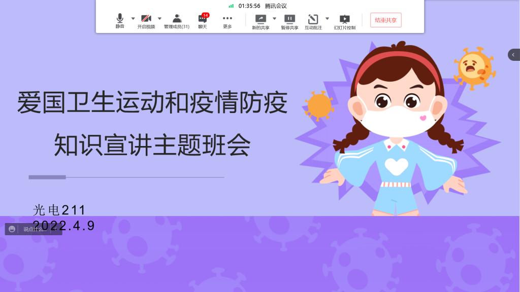 按照《关于莲湖校区学生公寓驻楼工作专班后续有关工作的通知》,2022年4月6日至4月10日,澳门pg官方电子平台各班级陆续召开了“爱国卫生运动及疫情防疫知识宣讲”线上主题班会。