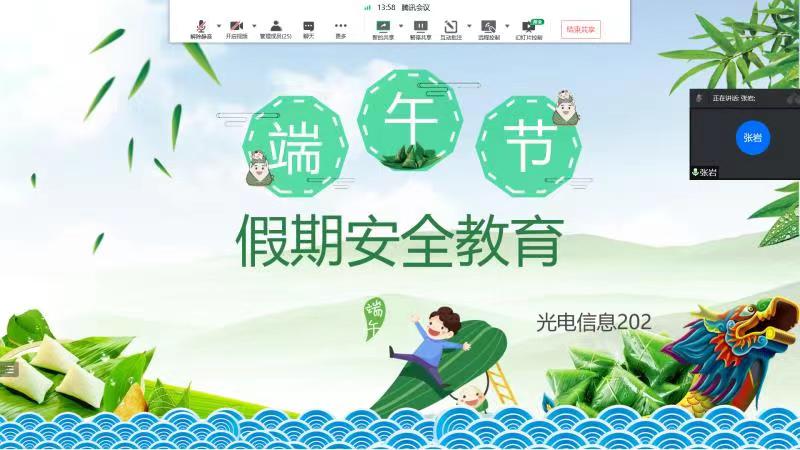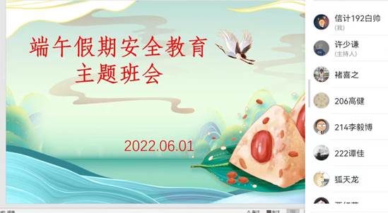 2022年6月1日,澳门pg官方电子平台各班级通过线上线下相结合的方式组织召开了端午节假期安全教育主题班会。班会由各班主任主持。