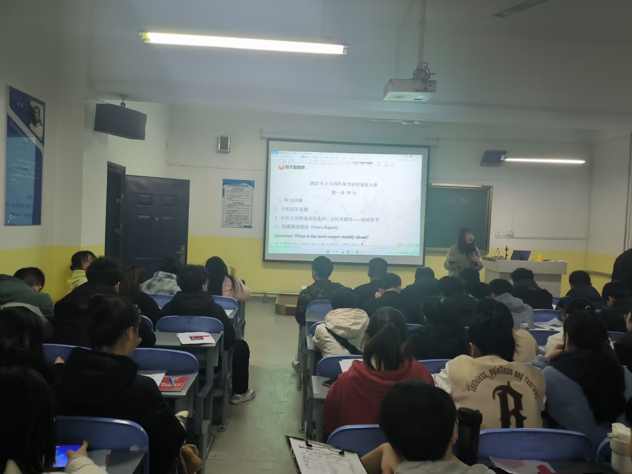 为加强学生对英语四六级题型的了解,提高考生考试水平,稳固考生对于通过考试的信心,2月28日晚七点,澳门pg官方电子平台在南楼233举办了四六级英语考前技巧指导课。课程特邀新文道考研李洁老师为考生传授考试经验和考试技巧。