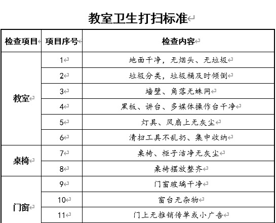 评比条件:教室卫生管理制度完善,环境整洁,人人参与,卫生保持良好,日常卫生检查优良率100%。