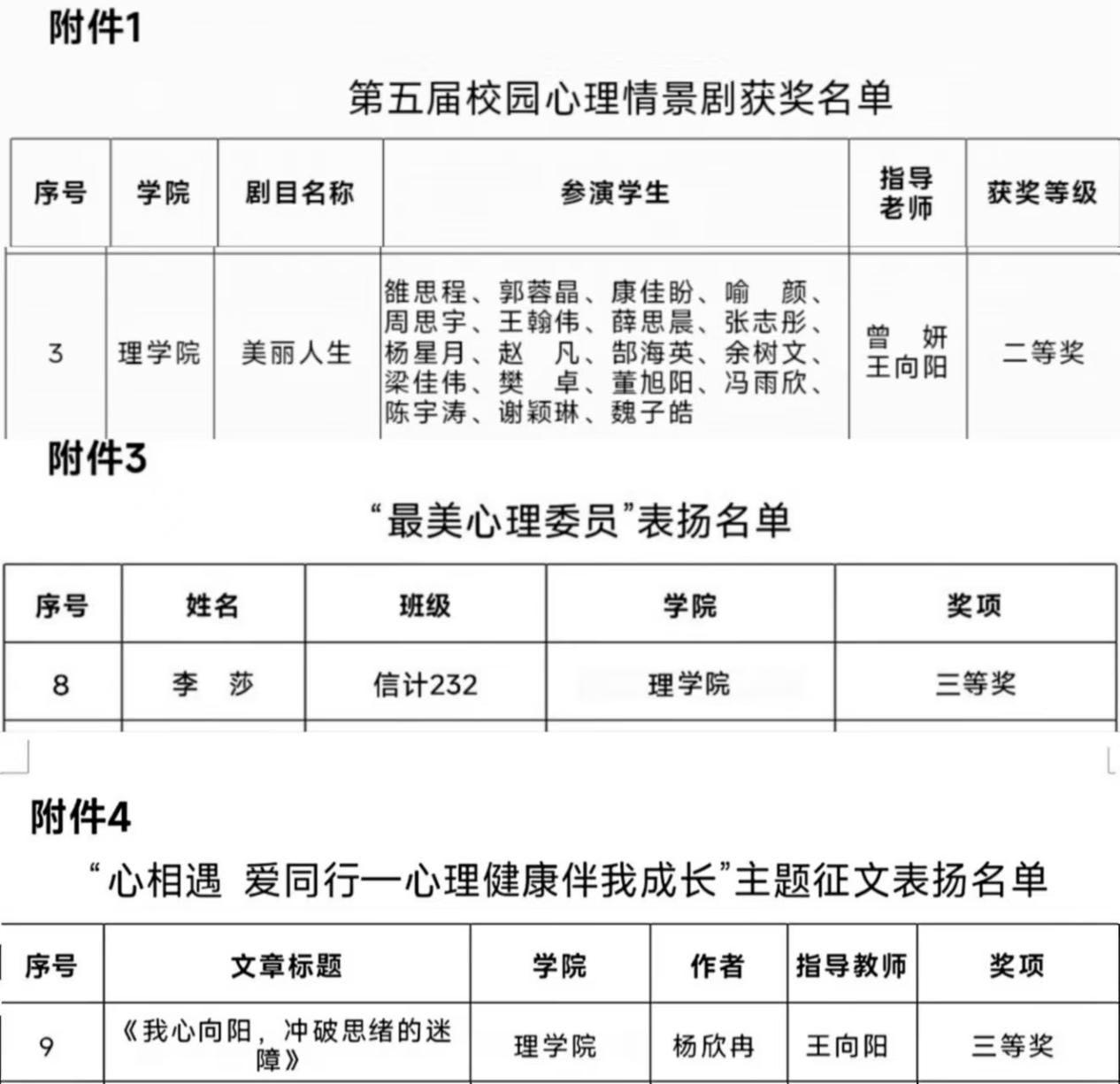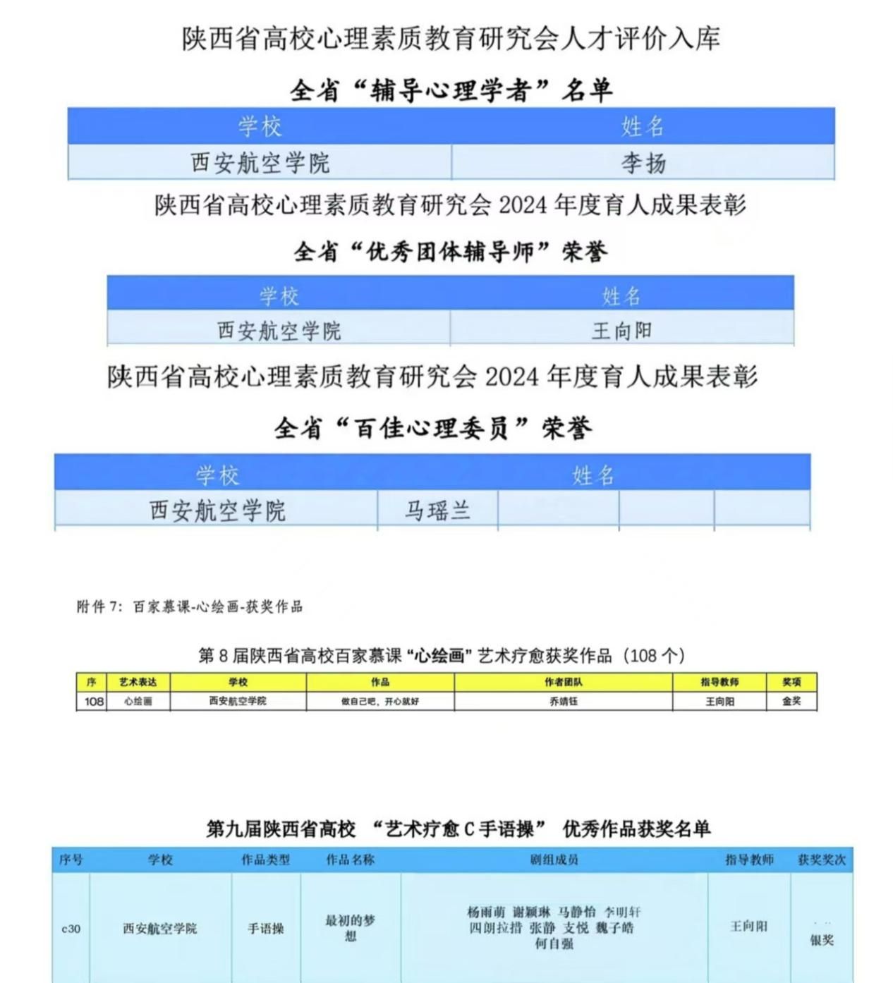 李扬入选陕西省高校心理素质教育研究会人才评价库,并获得全省“辅导心理学者”荣誉、王向阳获得全省“优秀团体辅导师”荣誉、马瑶兰同学获得全省“百佳心理委员”荣誉、乔靖钰同学创作的作品《做自己吧,开心就好》荣获全省“心绘画”艺术疗愈作品金奖、手语操《最初的梦想》荣获全省“艺术疗愈C手语操”作品银奖。心理剧《美丽人生》荣获学校第五届校园心理情景剧二等奖、李莎同学荣获学校“最美心理委员”、杨欣冉同学荣获学校“心相遇 爱同行—心理健康伴我成长”主题征文三等奖。