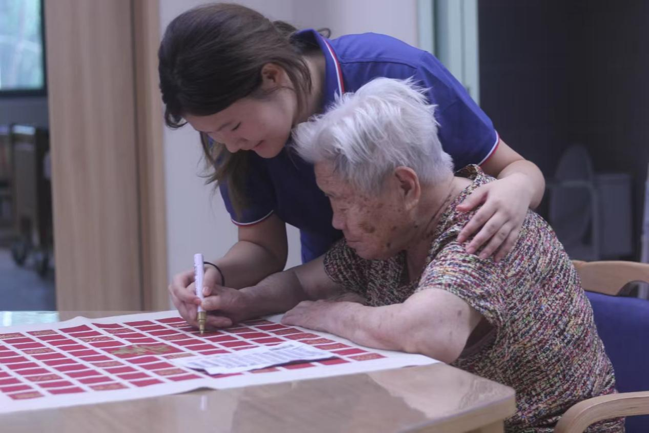 活动现场,志愿者们精心准备,将“寿”字书法跨越千年的演变娓娓道来。青年与银龄并肩执笔,共同在百寿图上挥毫。一位老人腰背挺直,挥毫泼墨间,筋骨遒劲的“寿”字跃然纸上,引来赞叹;邻座奶奶略显迟疑,身旁的志愿者小雒轻轻握住她的手,在纸上游走,笔迹渐成,老人的紧张化作了释然的笑容:“多少年没碰过这个了,有你带着,我也能写出来啦!”95岁的爷爷轻抚刚完成的墨宝,感慨道:“年轻时在学堂练过,后来放下了,这一写,记忆都回来了。”一位白发奶奶端详着自己的作品,眼中闪烁着孩童般的得意:“这个,可比刚才的好多了吧?”老人们的专注、感慨与自豪,在笔墨间流淌