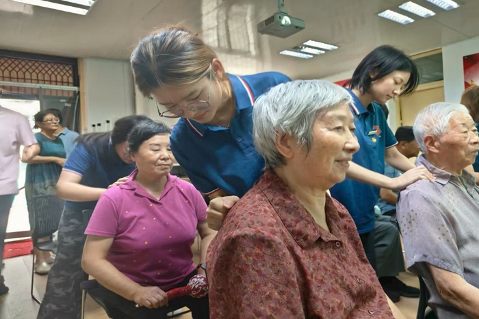 知识宣讲后,活动进入互动实践环节。在雒同学的示范和指导下,老教师们兴致盎然地学习自主按摩手法。实践队员们则化身“健康小助手”,一对一地辅助老教师们掌握要领,并运用所学技能,轻柔地为老教师们进行肩颈放松按摩,缓解日常疲劳。现场气氛温馨融洽,老教师们切实感受到来自后辈的关怀与温暖。随后,在舒缓音乐的陪伴下,闫同学和程同学带领队员与老教师们一同习练传统养生功法八段锦。一招一式,不仅弘扬了中华优秀养生文化,也有助于老教师们舒展筋骨、调和气血,现场暖意融融。