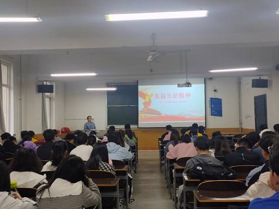 李扬老师讲到:2021年是中国共产党建党百年。100年来,我们党带领勤劳勇敢的中国人民不懈奋斗,迎来了从站起来、富起来到强起来的伟大飞跃。在这漫漫征途中,没有哪一次进步不是靠伟大精神引领。我们要学习革命先辈们传承下来的伟大精神,让精神之光,照亮我们前行的路。接着李扬老师为同学们说明了长征精神的内涵:诠释出乐于吃苦,不惧艰难的革命乐观主义;勇于战斗,无坚不摧的革命英雄主义;重于求实,独立自主的创新胆略;善于团结,顾全大局的集体主义。其主题是“一不怕苦,二不怕死”,其最显著的特点就是革命英雄主义精神。长征精神是中华民族百折不挠、自强不息的民族精神的最高表现,是保证我们革命和建设事业从弱小走向强大的精神力量。