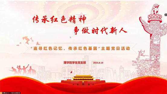 为深入学习贯彻习近平新时代中国特色社会主义思想主题教育,培养同学们的爱国主义情怀,传承和发扬老一辈革命家的精神,8月19日晚,澳门pg官方电子平台学生党支部通过腾讯会议线上开展了“追寻红色记忆,传承红色基因”主题党日活动。活动由王向阳老师主持,支部全体成员参与了此次活动。