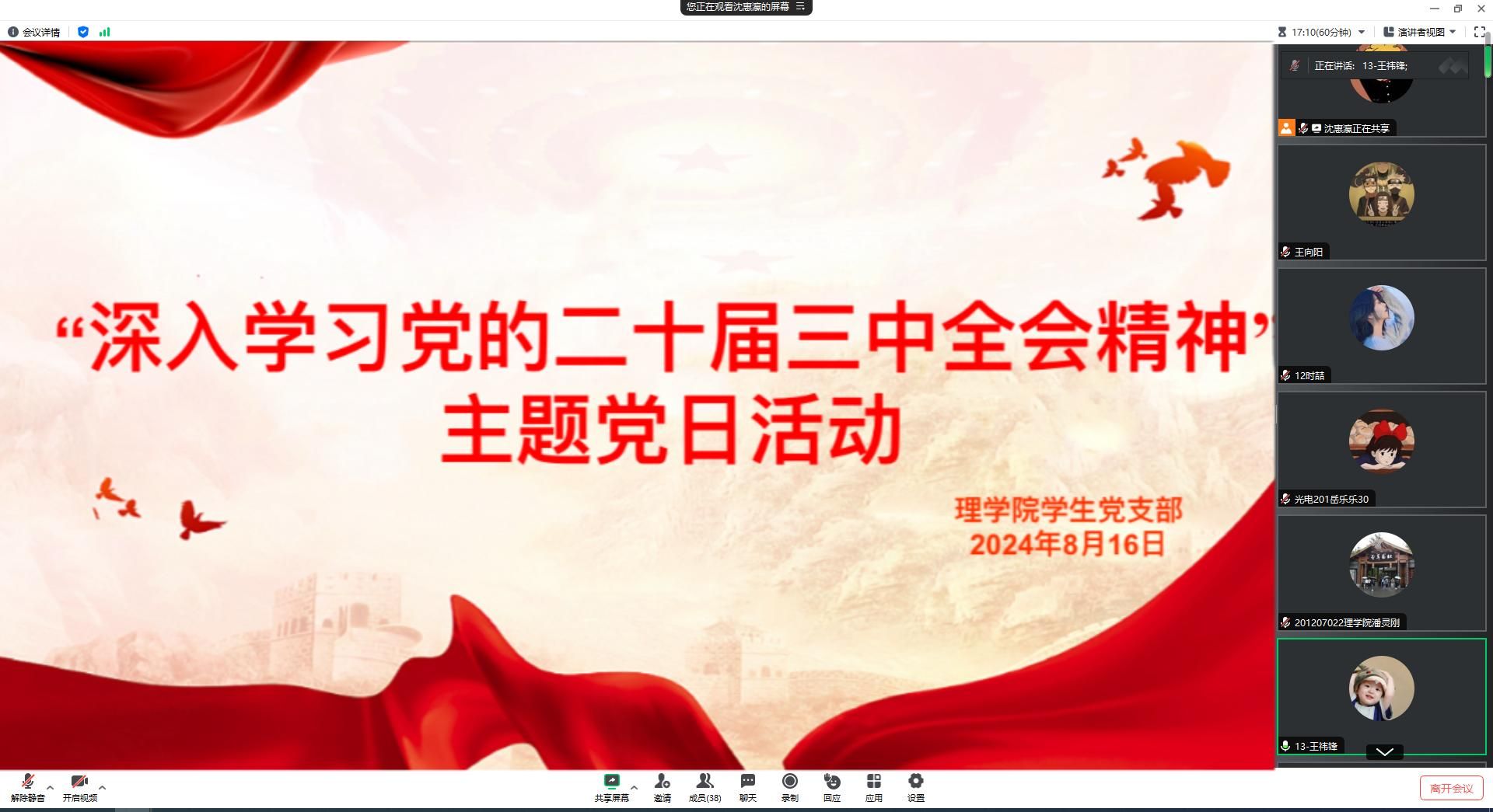 为深入学习宣传和贯彻落实党的二十届三中全会精神,2024年8月16日,澳门pg官方电子平台学生党支部于线上开展“深入学习党的二十届三中全会精神”主题党日活动。活动由支部书记李扬主持并领学,教师党员王向阳、曾妍、张岩以及支部全体学生党员参加本次学习。