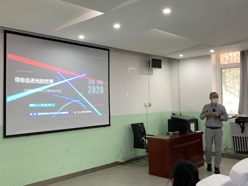 齐新元博士从“光电信息科学与工程专业简介”、“光电信息科学与工程专业能学到什么”、“光电信息科学与工程方向发展历程”、“光电信息科学与工程方向就业去向和要求”以及“我们该如何规划自己的大学四年时光”等五个方面给大家深入浅出地介绍了光电信息科学与工程专业的发展背景以及学术前沿问题。同时,齐新元博士给我们详细介绍了西北大学光电信息科学与工程专业的发展概况和专业方向,并鼓励学生们报考西北大学光学专业和光学工程专业硕士研究生。